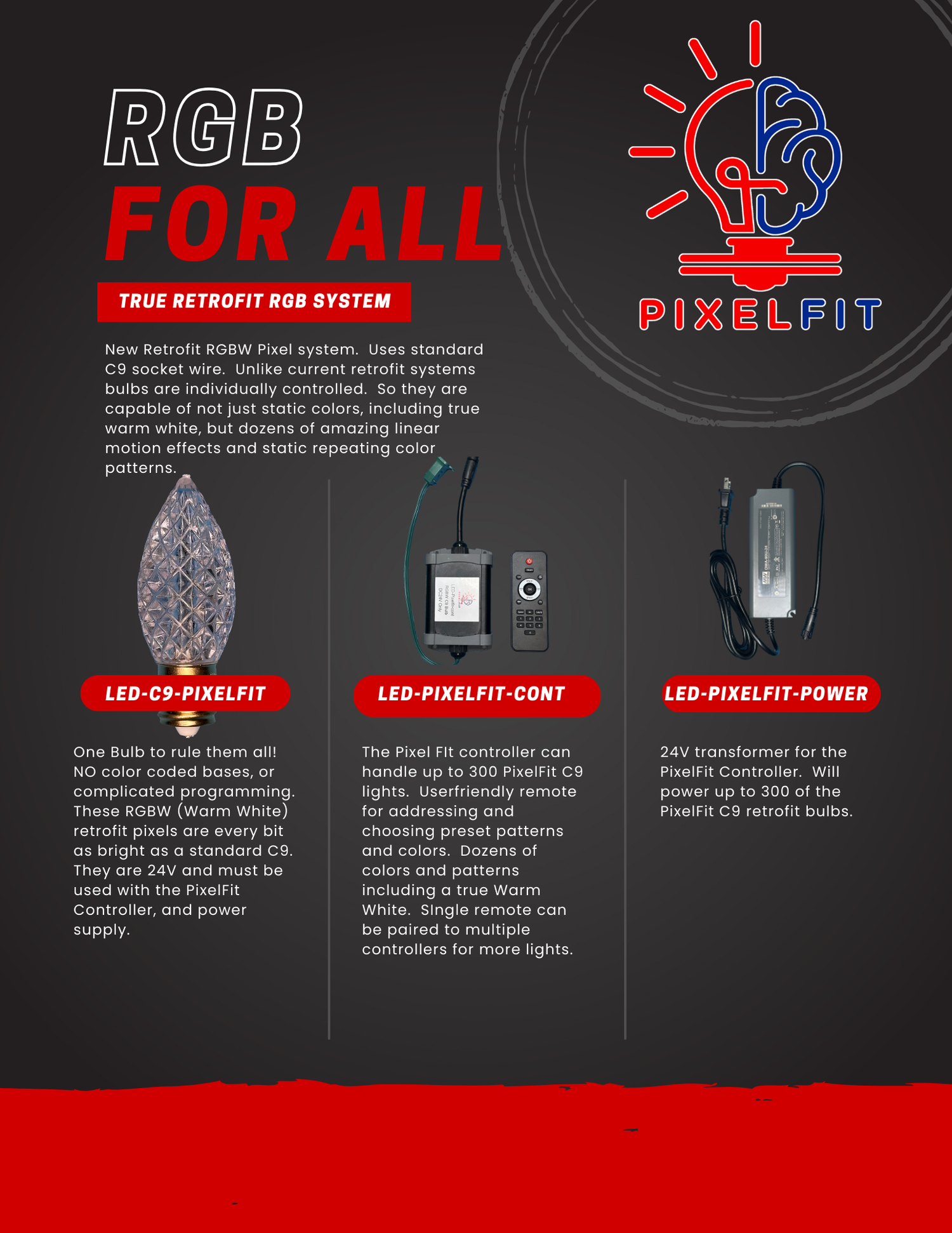 Our new Retrofit RGBW Pixel System uses standard C9 socket wire. Unlike current retrofit systems on the market, our bulbs are individually controlled. This means they are capable of not just static colors, but dozens of amazing linear motion effects and static repeating color patterns.